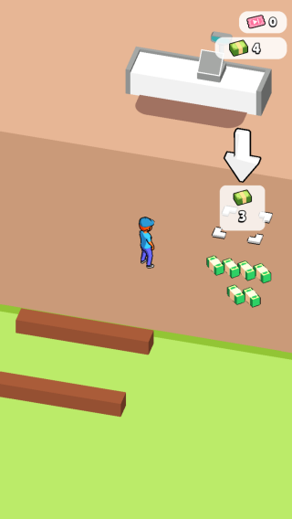 1、实体信息有:角色(戴蓝帽穿蓝衣)、货币(粉色钞票“0”张、绿色钞票“4”张及地面散落的“3”捆)、呈现玩家操控角色收集货币、积累财富的玩法场景。