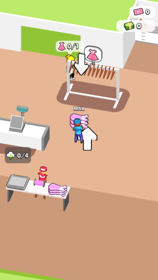 2、衣架(“0/1”连衣裙任务标识)、收银台、“0/4”云朵状标识、粉色布料,呈现玩家操控角色在服装店铺场景中,完成取衣等经营任务的玩法。