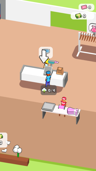 3、收银台(带箭头指向)、云朵状标识、粉色布料、棉花植株,呈现玩家操控角色在服装店或裁缝店场景中,进行收银、材料收集等经营操作的玩法。