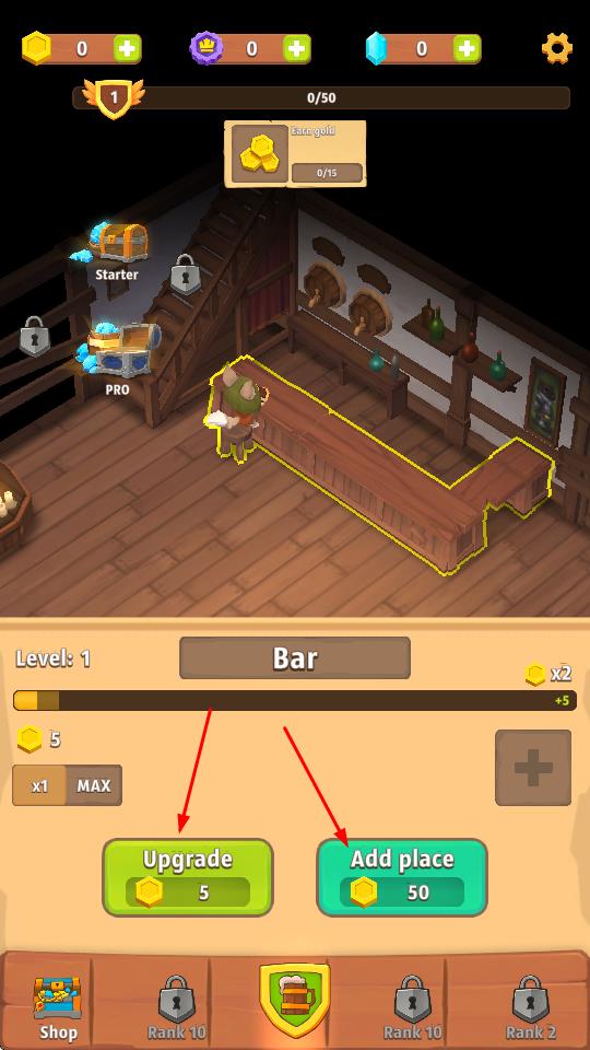 1、消耗金币,升级吧台、增加座位,拓展酒馆规模,提升经营能力。