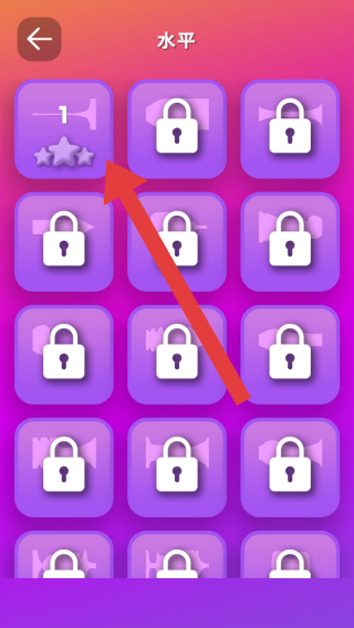 1、文字“水平”对应英文“Level”,即关卡,其中第1关已解锁(显示星星和关卡标识),其他关卡锁定(显示锁的图标),左上角有返回按钮。