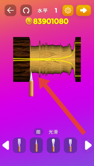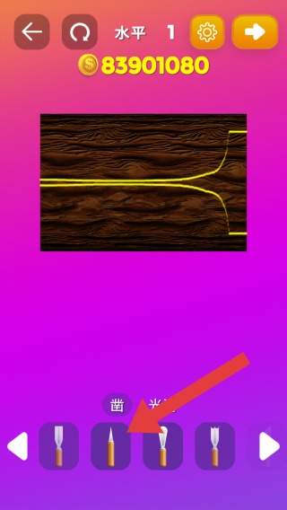 2、显示金币数量83901080,界面有木材雕刻区域、工具选择栏(含凿子等工具),属于木工雕刻模拟类的操作场景,用于玩家进行木材雕刻挑战。