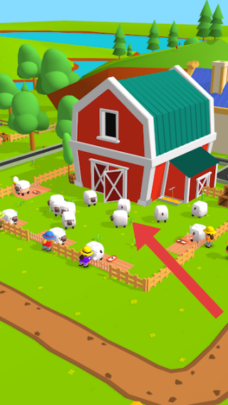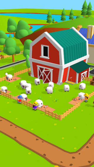 1、呈现了农场场景,有红色谷仓、羊群、戴着不同帽子的角色,还有河流、树木等环境元素,营造出休闲的农场经营氛围,玩家可经营管理绵羊农场,开展养殖等相关玩法。