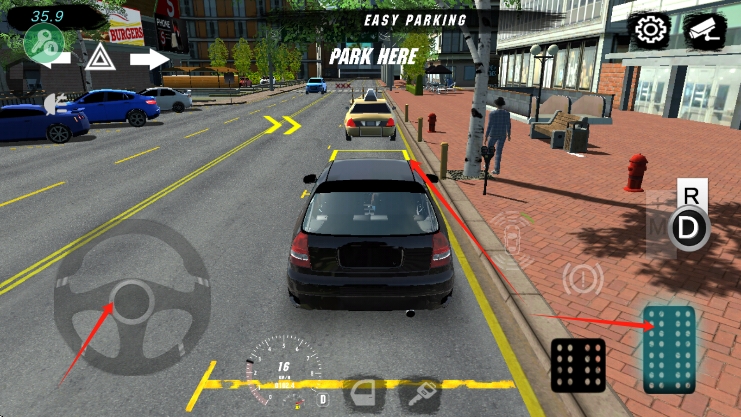 1、基础驾驶操作:可选择重力感应、触屏按钮、方向盘模拟操控方式,通过方向盘、挡位、油门、刹车控制车辆行驶与停车。