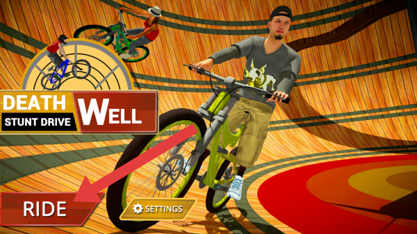 1、属于小轮车特技,玩家可操控角色在“死亡之井”的场地进行特技骑行,画面呈现了初始界面,有“RIDE”和“SETTINGS”按钮,角色骑着小轮车,背景还有其他特技骑行的场景展示。