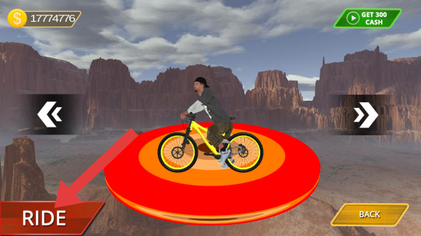 2、呈现的是场景选择或准备界面,有“RIDE”、“BACK”按钮,上方显示现金数量,还有“GET300CASH”的提示,背景是荒漠峡谷景观,角色骑着特技自行车准备进行特技骑行。