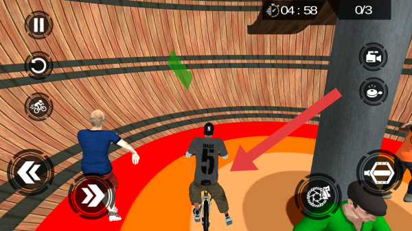 3、呈现的是特技骑行场景,玩家操控角色在环形场地进行小轮车特技挑战,界面有时间、任务进度等显示,还有各类操作按钮。