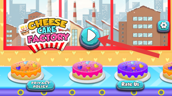 1、实体信息有:标题、播放按钮(开始游戏)、“PRIVACYPOLICY”“RateUs”按钮、设置图标,玩法是经营芝士蛋糕工厂,制作、售卖蛋糕。