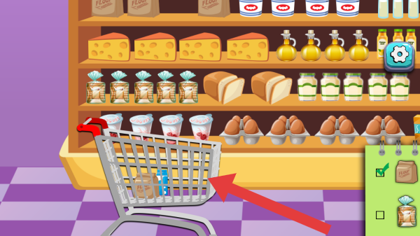 3、超市货架(陈列奶酪、面包、食用油、罐装食品、鸡蛋等)、购物车、清单(右侧绿色区域待购物品勾选状态),玩法是按清单在货架选商品放入购物车,完成购物任务。