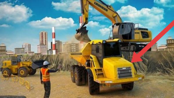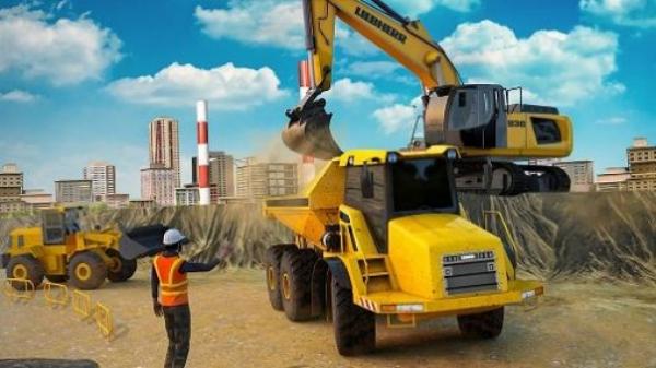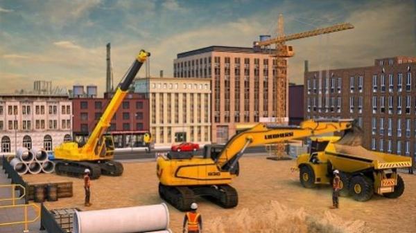 3、黄色利勃海尔(LIEBHERR)挖掘机、黄色起重机、黄色自卸卡车、建筑工人、城市建筑背景(含高楼、塔吊),展现建筑施工场景,玩法是操控工程车辆完成施工任务。