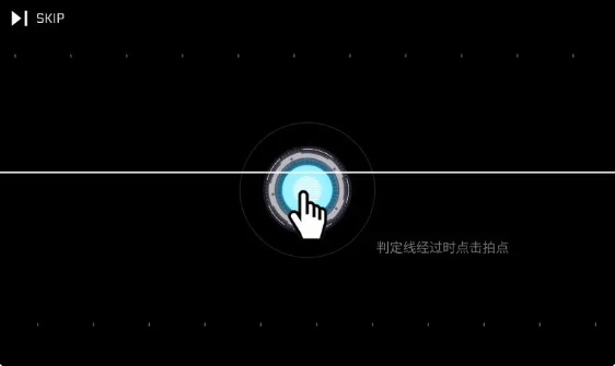 3、教学引导:左上角“SKIP”可跳教学,每类操作配文字+手势提示(如“判定线经过时点击拍点”),双维度辅助学习。