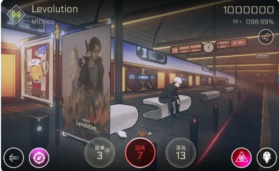 1、Levolution曲目:由MIDICO创作,设简单(3级)、困难(7级)、混沌(13级)难度,当前游玩TP达98.99%,界面构建地铁站场景。