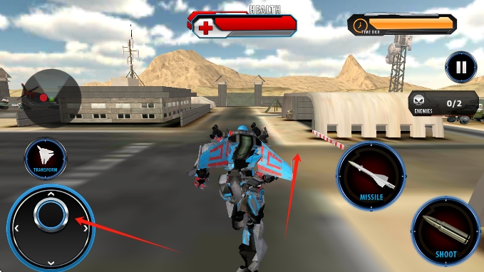 1、驾驶初始变形战机进入训练关卡,在空战场完成首次俯冲轰炸,体验战机变形成机器人的瞬间切换。
