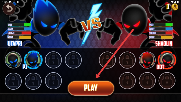 2、选好角色(如UTAPRI-vs-SHAOLIN),点击【PLAY】,进入格斗场景,操控角色与敌人战斗。