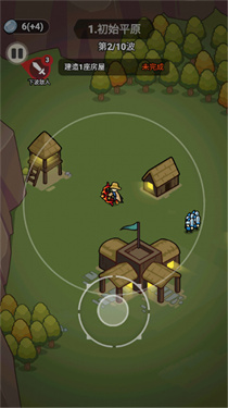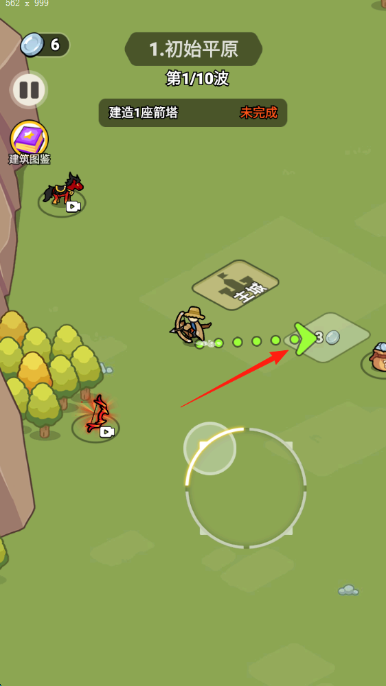 2、建筑布置在草地场景,按指引建造箭塔(绿色光标处),消耗金币(6),完成“建造1座箭塔”任务。