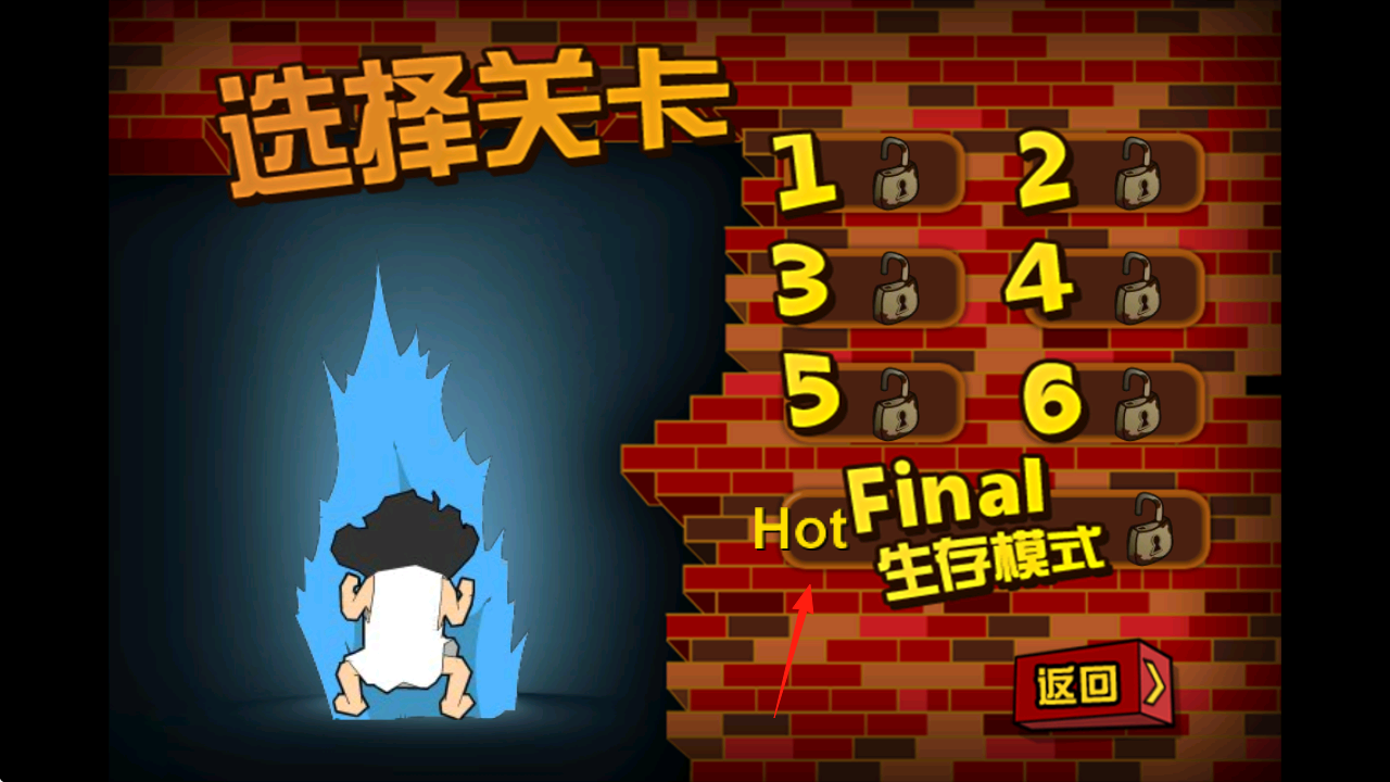 1、关卡选择选“HotFinal生存模式”等关卡,进入挑战,界面有角色被火焰包围的趣味设计。