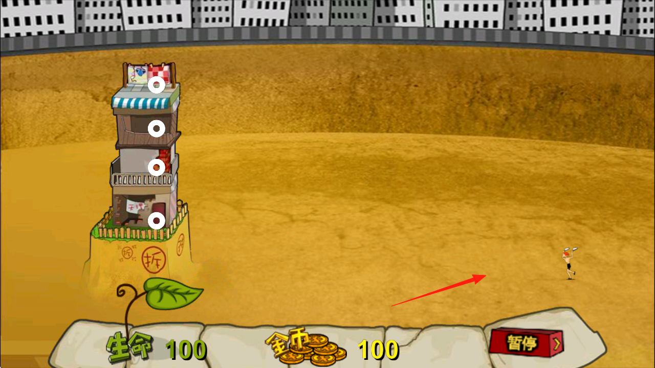 2、塔防基础在“拆”字建筑场景,布置防御,用金币(100)建塔,抵御右侧来袭敌人。