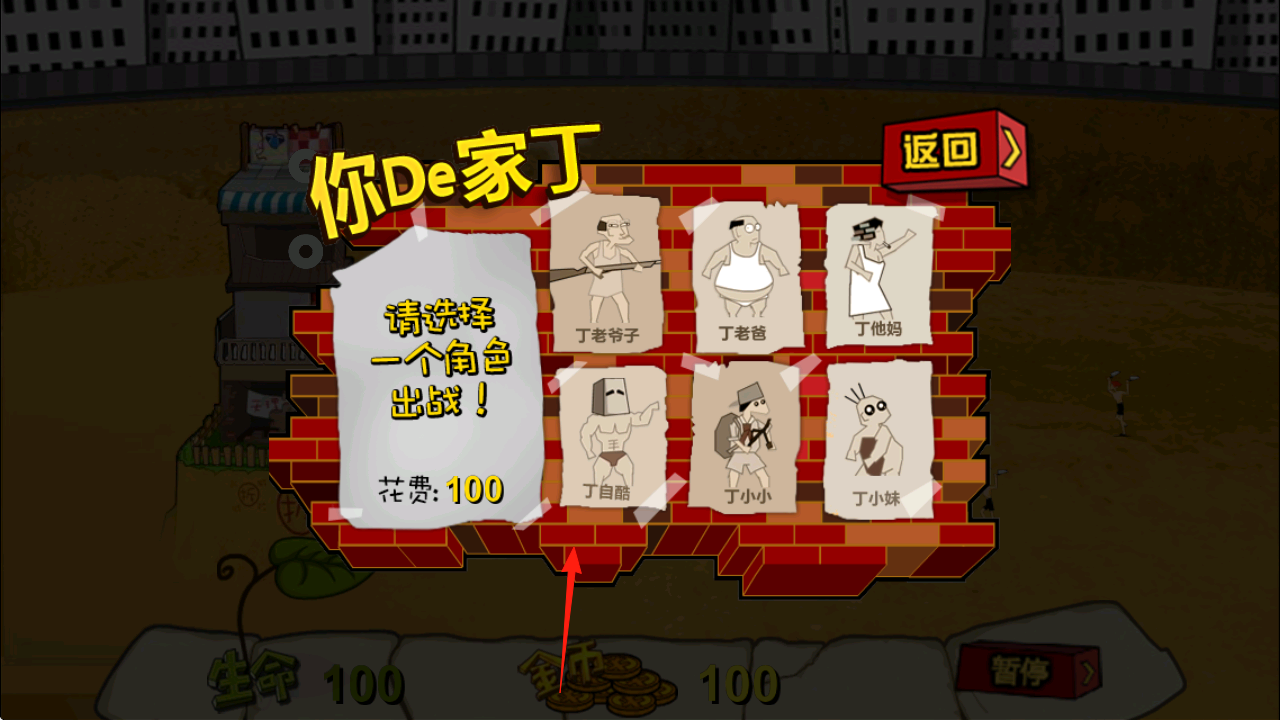 3、角色出战花费100金币,选“丁老爷子”“丁老爸”等家丁角色,派其参战,协助塔防。