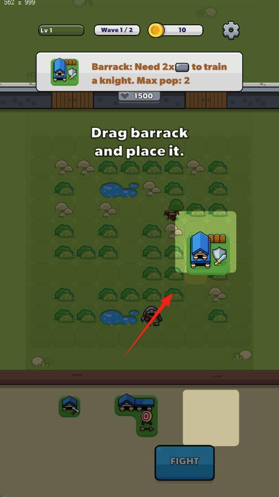 2、建筑布置拖动“Barrack(兵营)”到草地场景,消耗资源(2x矿石),训练骑士,提升防御。