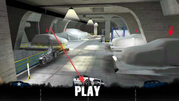 2、进入车库场景,点击下方【PLAY】按钮,选定摩托(如画面中车辆),进入隧道赛道,准备开始竞速挑战。