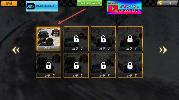 2、选择解锁的【水平1】,开启雪地越野任务。