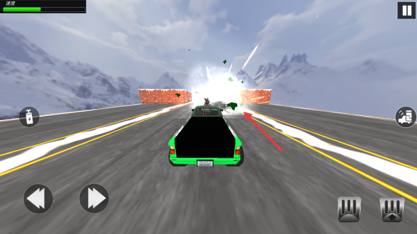 3、操控绿色越野车,在雪地赛道撞击障碍前行。