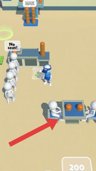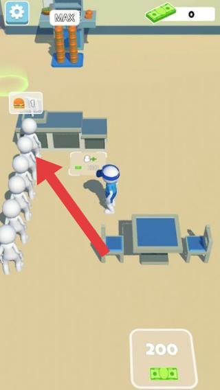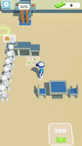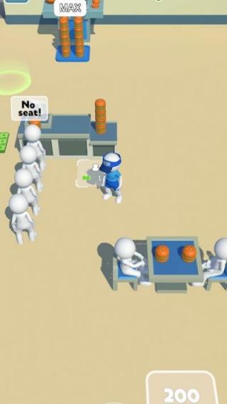 2、玩家扮演店主,需引导排队顾客(图中白色小人队列)就座、服务,通过经营餐厅(如制作售卖餐品)获取收益,体验餐厅运营的策略与乐趣。