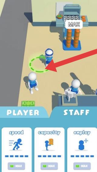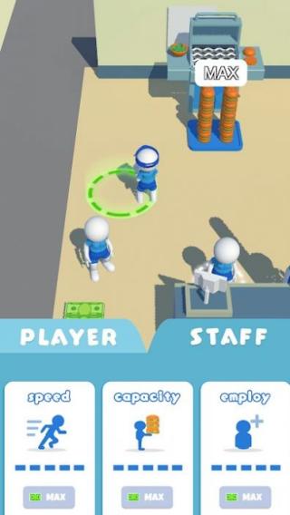 3、玩家可操控角色(“PLAYER”),还能管理员工(“STAFF”),通过升级速度(“speed”)、容量(“capacity”)等属性,调配员工服务顾客、制作餐品,经营餐厅获取收益。