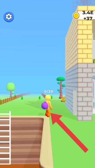 1、玩家操控角色(图中黄色小人)在场景中收集资源、建造建筑,通过积累金币(右上角“3.4E+37”)推进,体验从收集到建造的经营建造乐趣。
