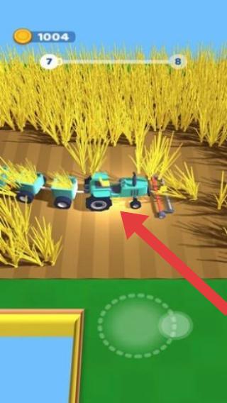 2、玩家操控收割机在农田收割作物(如画面中的黄色作物),通过此类经营操作积累金币(左上角显示“1004”),是常见的模拟农场劳作、主打轻松经营体验。