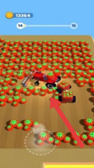 3、玩家操控农机(图中红色车辆)在番茄田收割,通过收获作物积累金币(左上角“13364”),是模拟农场劳作、轻松经营,可体验农场机械收割作物的乐趣。