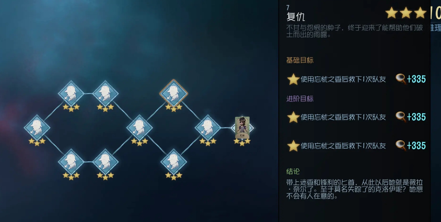 3、复仇:基础/进阶目标为使用忘忧之香后救下1次队友(共3次),结论揭露“薇拉携带迷香和匕首取代克洛伊,后者莫名失踪,无人在意”,直指身份替换的黑暗过往。