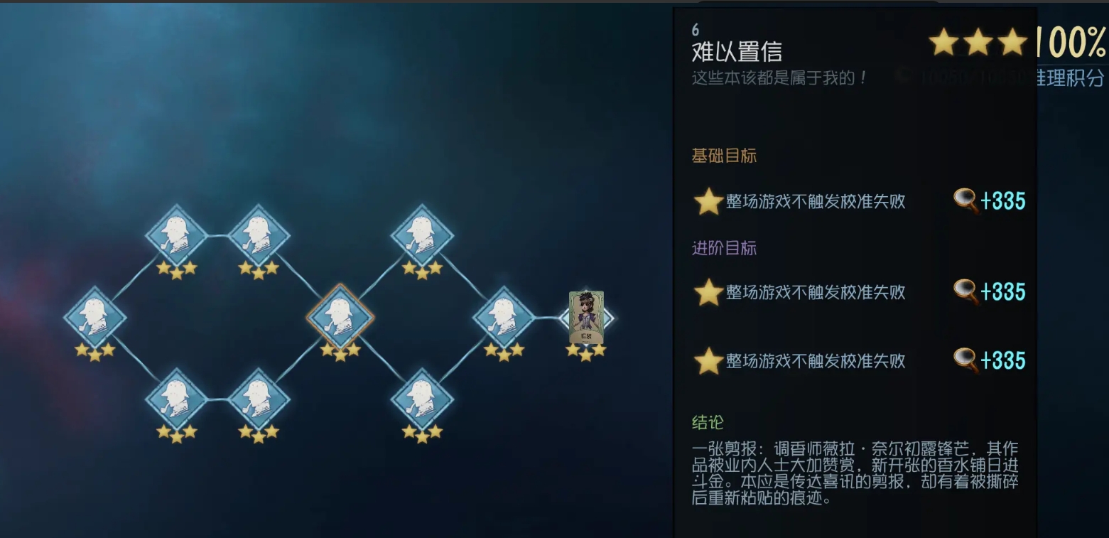 2、难以置信:基础/进阶目标为整场不触发校准失败,结论曝光剪报:调香师薇拉初露锋芒,香水铺日进斗金,但剪报有撕碎重贴痕迹,暗示荣誉背后的阴谋。