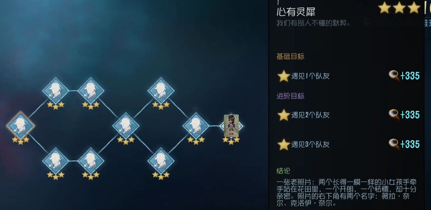 1、心有灵犀:基础/进阶目标为遇见1~3个队友,结论揭示老照片——薇拉·奈尔与克洛伊·奈尔是双胞胎,性格一开朗一怯懦,关系亲密。