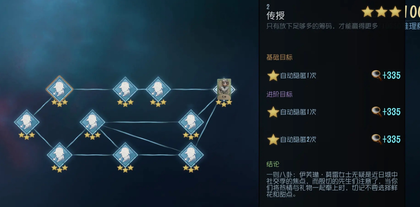 2、完成【传授】推演,需达成自动隐匿1/1/2次:法罗女士在监管者18米外自动进入隐匿状态,累计对应次数,即可解锁“伊芙琳成社交焦点”的八卦结论。