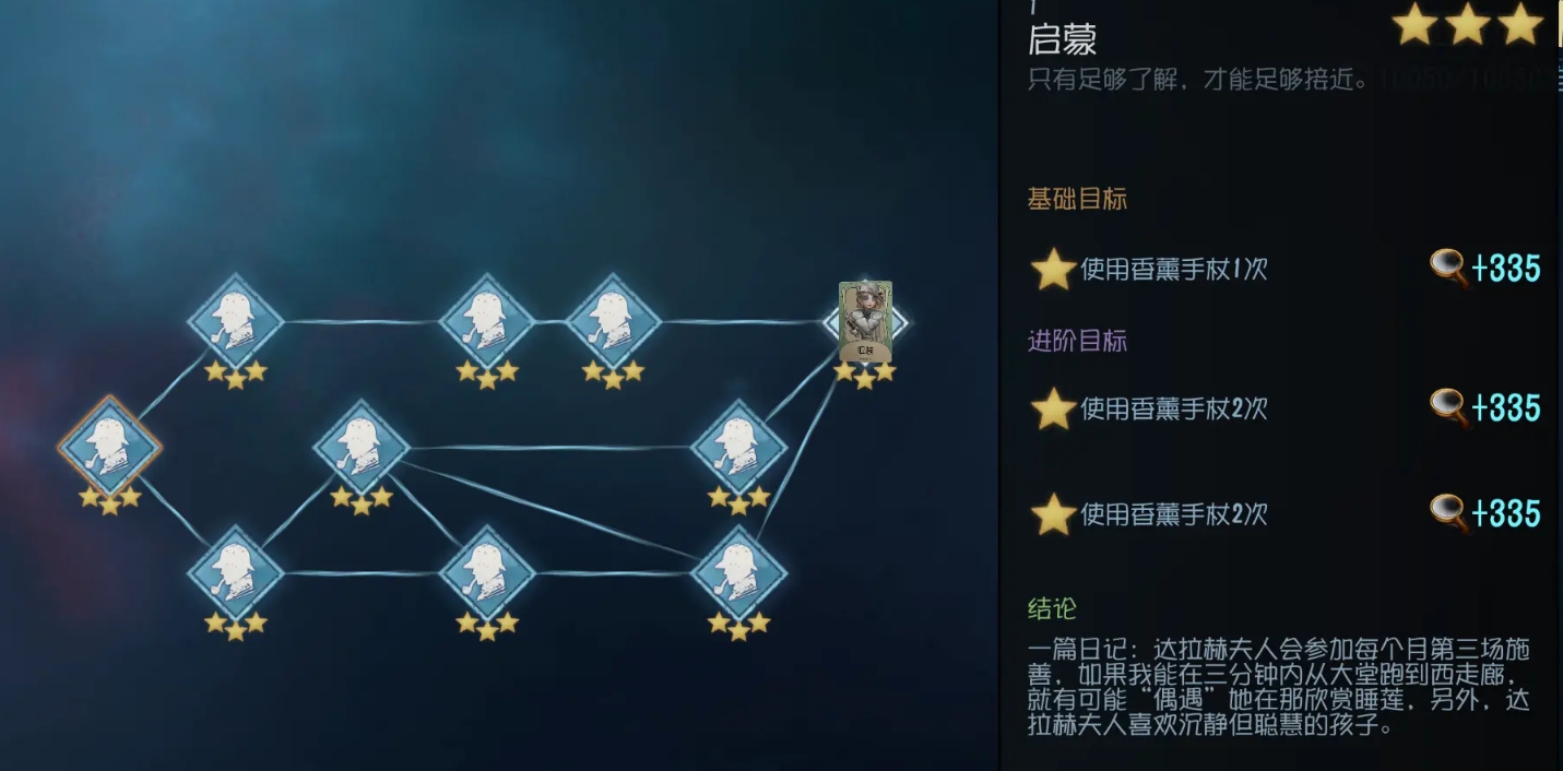 3、达成【启蒙】推演,需使用香薰手杖1/2/2次:点按或长按释放香薰手杖,产生监管者可见的香气轨迹,完成次数后,解锁“达拉赫夫人施善信息”的日记结论。