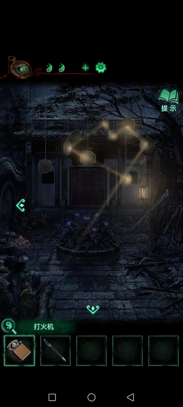 1、在庭院外,使用【打火机】点亮大门两侧灯笼,结合石狮子线索(左“1246”、右“九鬼叩门”),按顺序敲门,开启庭院探索。