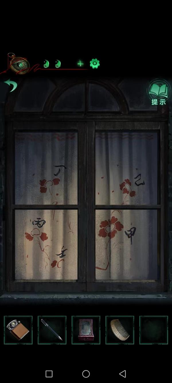 2、进入侧院,用【圆珠笔】戳破窗户纸,观察窗帘上的干支文字【壬、丙、丁、己、甲】,记录该顺序,后续用于石狮子拨号盘解谜。