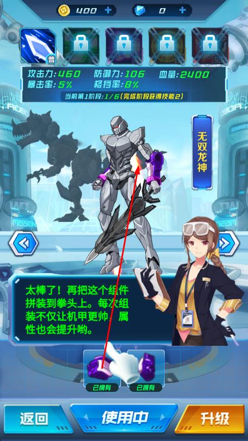 3、丰富关卡挑战:众多挑战关卡等待玩家参与,成为优秀机甲战士,通过闯关收集材料,强化机甲武器装备。