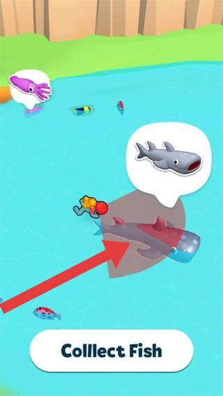 1、玩家操控角色在水域收集鱼类,图中有鲨鱼等不同鱼类,属于轻松收集玩法,和常见休闲益智品类一致,通过完成收集目标推进关卡。