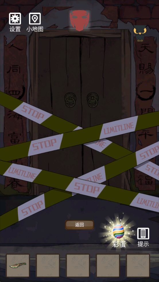 2、物品收集阶段需对门口警戒线使用匕首,根据门两边对联提示敲门打开屋门,在客厅案台抽屉中获得放大镜,打开右侧门进入小黑屋,点击黑板完成连线游戏。
