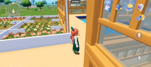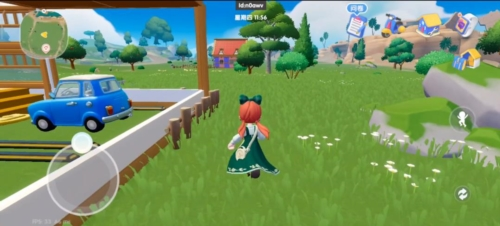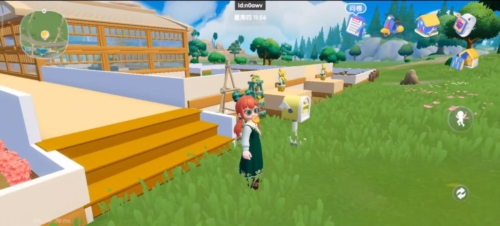 2、出庭院别忘开“地图”!找蓝色小车,能快速去小镇、餐厅,路上看到白色小花,走近采集,攒材料做装饰,遇到NPC(像机械兔)。