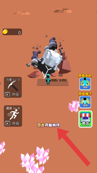 1、属于挖矿类模拟经营,玩家可升级力量、速度等属性,开启挖矿冒险,还有皮肤、商店等系统,点击【点击开始游戏】可进入挖矿流程。