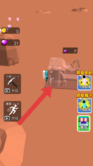 3、属于挖矿模拟经营类,玩家操控角色挖掘矿石,可升级力量、速度等属性,还有皮肤、帽子获取及商店系统,图中呈现角色在矿场挖掘场景。