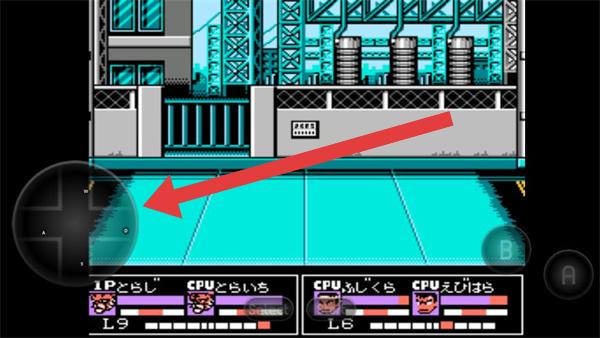 1、操控1P角色(“にし”,等级9),在工厂场景移动(箭头指向),利用虚拟摇杆,躲避CPU2(“にし”,等级8)攻击。