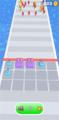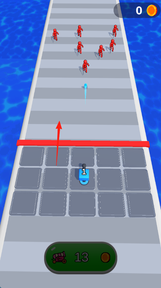 2、炮台放置在路径格子部署蓝色炮台(等级1),自动发射弹药,拦截红色火柴人敌人。