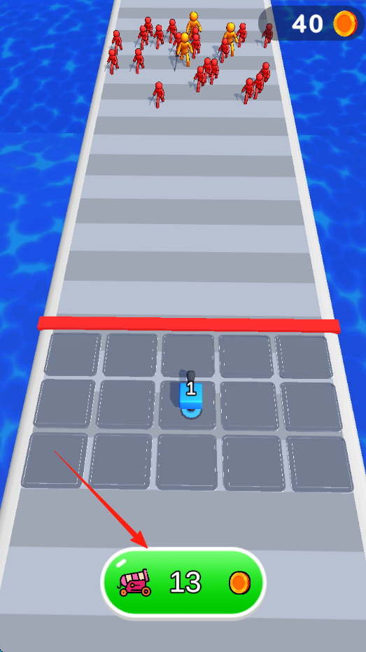 3、合并升级积累金币(0→40),点击绿色按钮(数字13),合并炮台提升等级,增强防御火力。