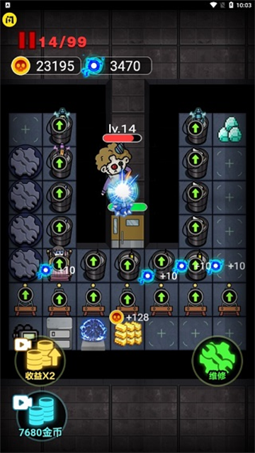 2、战斗过程中,玩家需逐步累积金币和电气,用于建造各种防御装置,如能量护罩、笤帚炮塔、老旧游戏机等,每种道具都有不同功能。