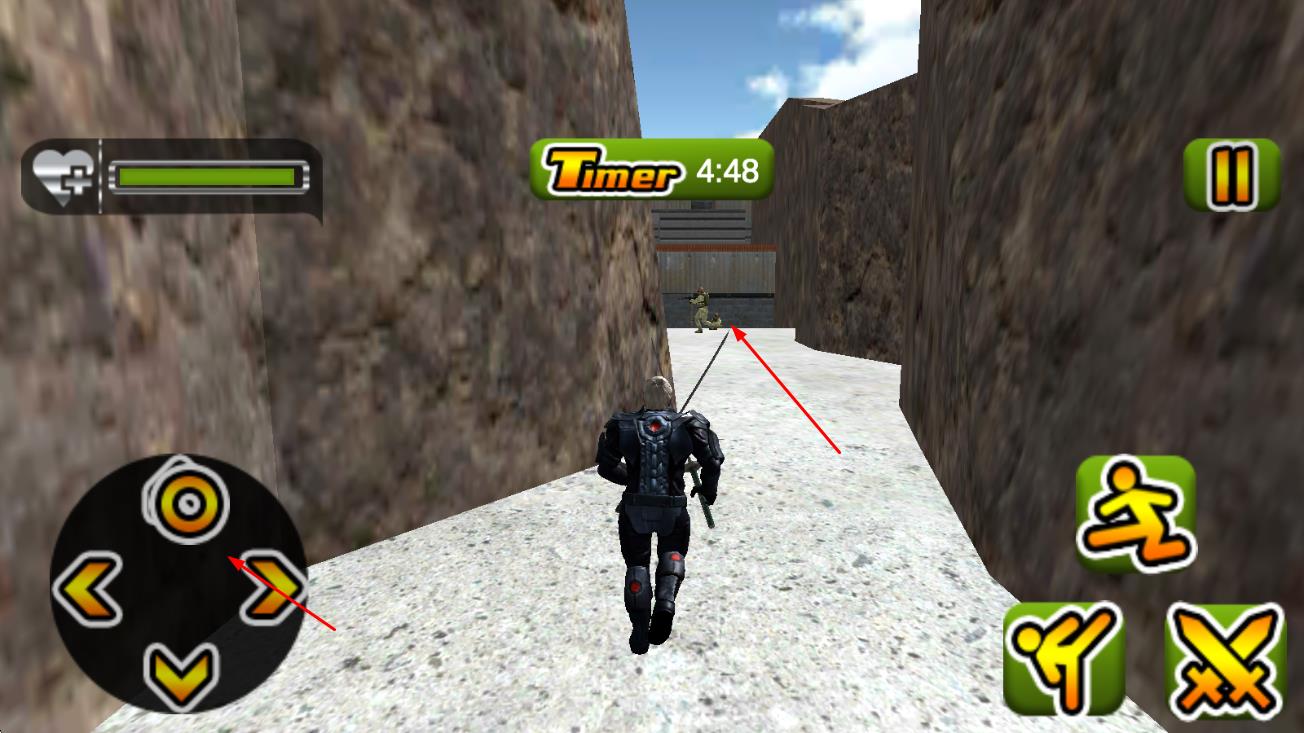 1、进入游戏后操控双剑英雄潜入基地,观察守卫巡逻路线,寻找防守漏洞开启暗杀任务。