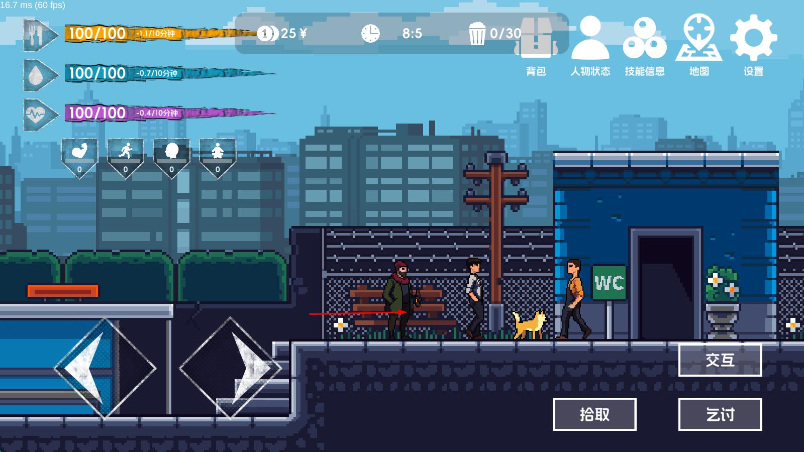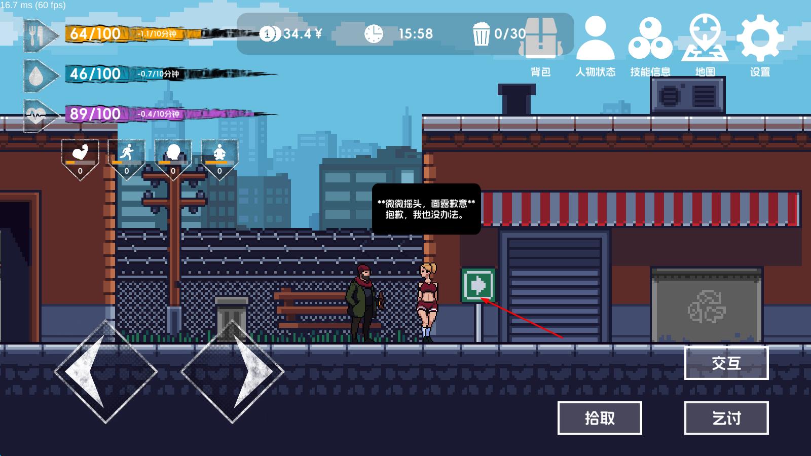 2、游戏中途,通过捡垃圾、餐馆打工等方式获取资源,时刻关注身体数据,合理分配饱食度与精神度,同时积攒技能点强化捡垃圾相关能力。